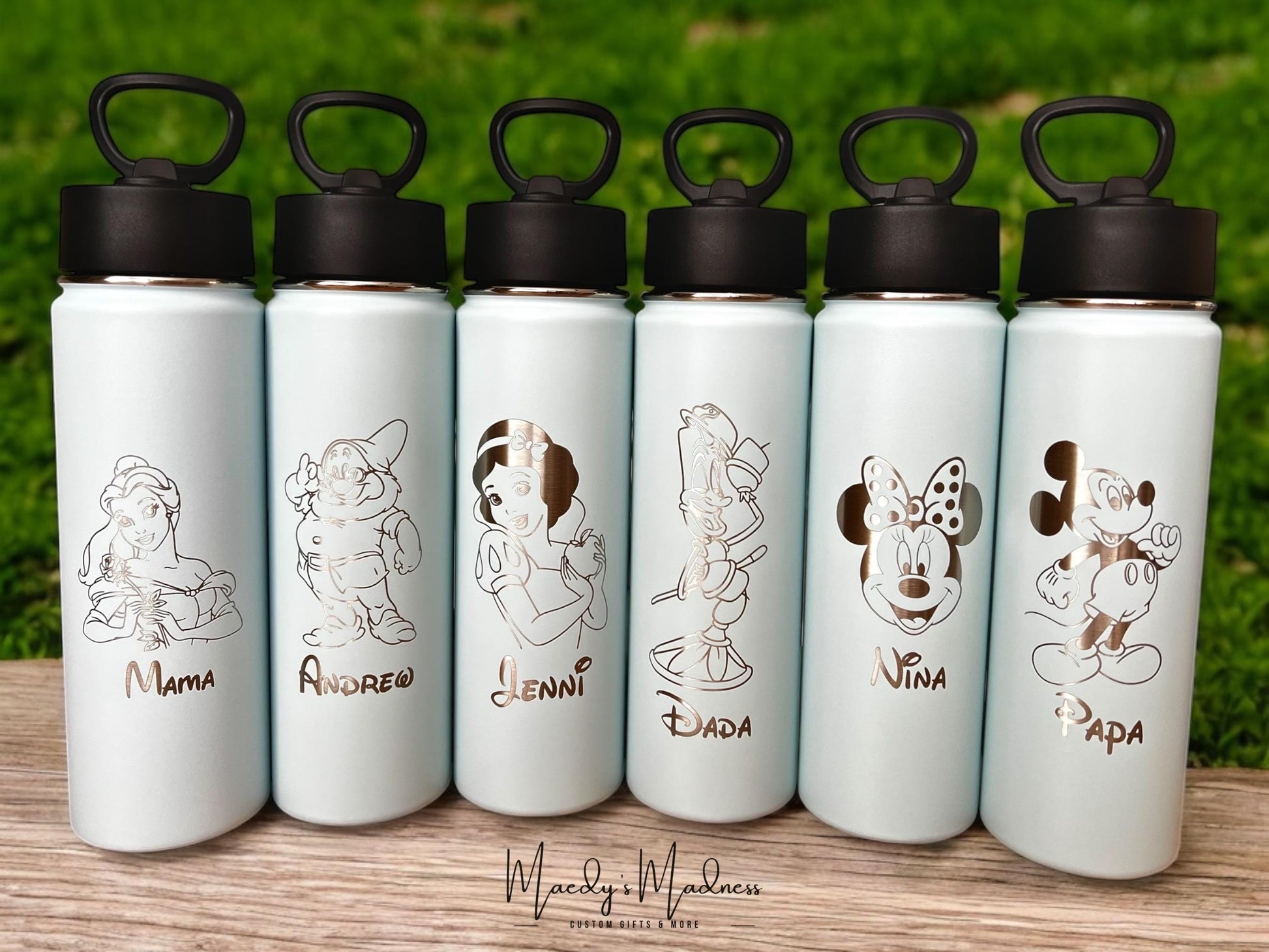 Each bottle is engraved with your favorite Disney-inspired character and can be personalized with a name for that extra special touch.